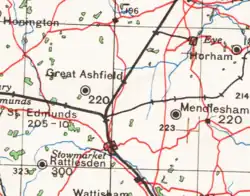 - "a parish in Hartismere district, Suffolk; on the Eastern Union railway, 1½ mile S of Finningham r. station, and 6 N by E of Stowmarket. The church is good; and there is a Wesleyan chapel, a parochial school, and charities."[5]