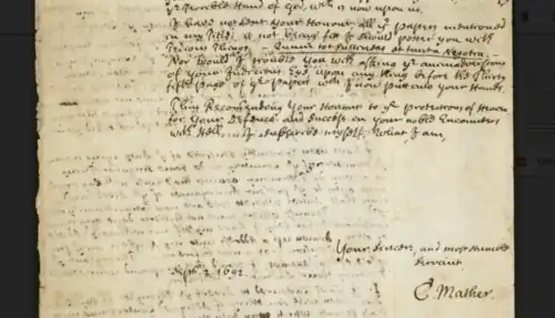 letter written to a group of New England sailors captured in the 1680s and 90s, he expresses the determination of the community to exhaust all means to bring them home […] offers encouragement to the enslaved men […] "your slavery to the monsters of Africa will be but short"