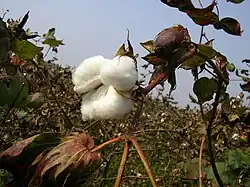 Cotton production in China pertains to cotton which is the prime cash crop of China. Its production was the highest in the world (in excess of 20 percent of world production) from 1982 until being overtaken by India. Twenty-four of the 35 provinces of China grow cotton, with nearly 300 million people involved in its production. It is the main input for textile industry of the country with cotton textiles now accounting for 80% use vis-à-vis 95% in the 1950s. The cotton textile industry employs over 10 million people.[1][2] Its production in 2012–13 was 7.6 million tons, but in 2013–14 it dropped to 7 million tons.[3] Historically, its introduction in China is considered a 'southernization', a crop which originated from southern Asia (India) during the "proto-globalization" period.[4]