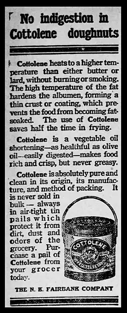It was cottonseed's depressed value that led a newly formed Procter & Gamble to utilize its oil.[40] The Panic of 1837 caused the two brothers-in-law to merge their candlestick and soap manufacturing businesses in an effort to minimize costs and weather the bear market.[39] Looking for a replacement for expensive animal fats in production, the brothers finally settled on cottonseed oil. Procter & Gamble cornered the cottonseed oil market to circumvent the meat packer's monopoly on the price. But as electricity emerged, the demand for candles decreased.[40] Procter and Gamble then found an edible use for cottonseed oil. Through patented technology, the brothers were able to hydrogenate cottonseed oil and develop a substance that closely resembled lard.[39] In 1911, Procter & Gamble launched an aggressive marketing campaign to publicize its new product, Crisco, a vegetable shortening that could be used in place of lard.[42] Crisco placed ads in major newspapers advertising that the product was "easier on digestion ... a healthier alternative to cooking with animal fats ... and more economical than butter."[43] The company also gave away free cookbooks, with every recipe calling for Crisco. By the 1920s the company developed cookbooks for specific ethnicities in their native tongues.[43] Additionally, Crisco started airing radio cooking programs. Similarly, in 1899 David Wesson, a food chemist, developed deodorized cottonseed oil, Wesson cooking oil.[40] Wesson Oil also was marketed heavily and became quite popular too.