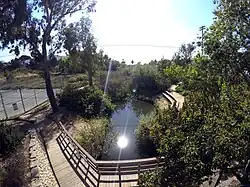 Beginning in 1881 steam locomotives stopped to replenish their boilers with the water from Cottonwood Creek which produced the steam that moved the trains.[1] A town formed around this site and would evolve into Encinitas. The creek was also a water source for the community in times of drought. For these reasons, in 1991 it was designated by the State of California a Point of Historic Interest.[2]