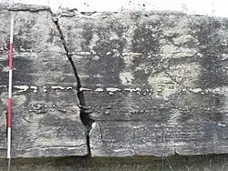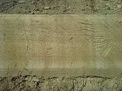 A longitudinal-section of siliceous nodule seen in split face blocks. -
