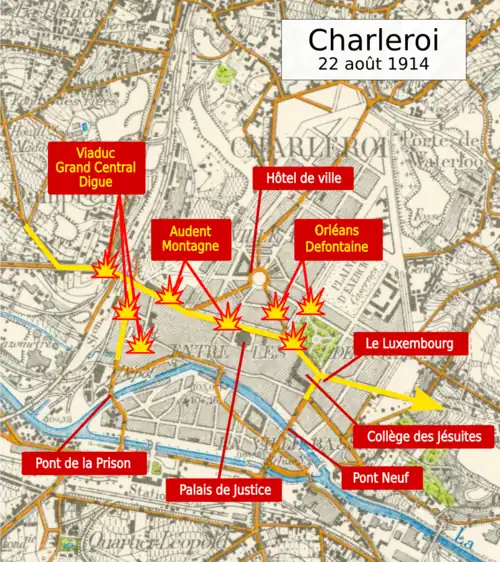 As the French had already evacuated the area, the German officers thought it would be difficult to take the Ville Basse and the bridges over the Sambre before the end of the day, so they turned east towards Montignies-sur-Sambre.[21]