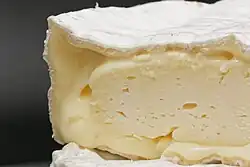 Coulommiers (French pronunciation: [kulɔmje] ⓘ) is a soft ripened cheese from Coulommiers, Seine-et-Marne, France.[1][2][3] It is made from cow's milk, and is usually in the shape of a disc with white, bloomy, edible Penicillium candidum rind.[4] When produced as an artisanal or "farmhouse" cheese from unpasteurized milk, it has some reddish blush in parts of the rind. The period of ripening when made of pasteurised whole milk is about four to six weeks.[5] The fat content is 40 per cent.[6][7][8][9][10][11][12]