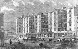 The City of London Corporation built tenements in Farringdon Road in 1865,[12] but this was an isolated instance. The first council to build housing as an integrated policy was Liverpool Corporation,[13] starting with St Martin's Cottages in Ashfield Street, Vauxhall, completed in 1869.[14] The Corporation then built Victoria Square Dwellings, opened by Home Secretary Sir Richard Cross in 1885.[15]