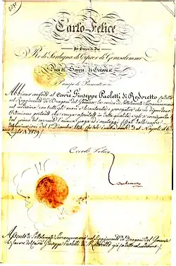 The village of Rodoretto is a small village in the Region of Piedmont, Italy which still exists today[1]. At some point in its history, Gaspare Paoletti di Rodoretto was made Count, presumably due to his military proficiency. The Count of Rodoretto lineage begins with the aforementioned Gaspare Paoletti Conte di Rodoretto dell Perero Presidente Reggente de la Gran Camelleria del Regno di Serdegna[4] sometime before 1800s. Afterwards it continues to Giacinto Paoletti di Rodoretto Maggiore d'amanta. Then Giuseppe Paoletti. Next is Jacinto (Written as Giacinto in the family tree) Paoletti who was the father of Maria Luisa Paoletti who was the last Countess of Rodoretto.