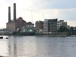 The upper reaches have been variously known as Billingswell Ditch, Pools Creek and Counters Creek. In the Middle Ages, the creek was known as Billingwell Dyche, derived from 'Billing's spring or stream'. It formed the boundary between the parishes of Kensington and Fulham. By the eighteenth century, the creek had become known as Counter's Creek, which is believed to derive from 'Counter's Bridge' which crossed the creek at the west end of Kensington High Street. This was first recorded in the fourteenth century as 'Countessesbrugge', and may be called after Matilda/Maud, Countess of Oxford, who in early centuries after the Conquest held the manor of Kensington.[7][8] Stamford Bridge is considered to be a corruption of 'Samfordesbrigge' meaning 'the bridge at the sandy ford' where the Fulham Road crosses the brook.[9] The existing Stamford Bridge was built of brick in 1860–2 and has been partly reconstructed since then. The name is more generally used to refer to the nearby Stamford Bridge Stadium, which is the home of Chelsea Football Club. In 1824–8 the lowest part of the creek was developed into the Kensington Canal. This was taken over by the Bristol Birmingham & Thames Junction Railway in the 1830s and subsequently much was culverted to take the West London Line along its course in 1859–63.[10] This railway route links Clapham Junction to Willesden Junction via Kensington Olympia. Only the lower reach remained in use, supplying coal to Sands End gas works and later to Lots Road Power Station.[5] The stream was visible as a surface river on the west side of Little Wormwood Scrubs on Ordnance Survey maps pre-1930 by which time surface water drains had been introduced, some of which fed the sewer, others which conveyed surface water separately.