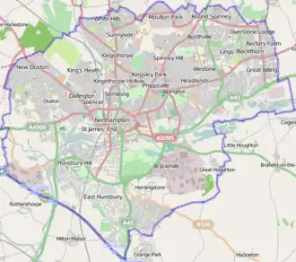 Concurrent with the abolition of the borough of Northampton in 2021, the unparished area of Northampton became parished with three new parish councils being established: A new Town Council covering the majority of the urban area of Northampton was established, whilst the areas of Kingsthorpe, and Far Cotton and Delapré also gained parish councils.[71] In addition, there are nine registered parish councils which predate the abolition of the borough of Northampton. These are Billing, Collingtree, Duston, Great Houghton, Hardingstone, Hunsbury Meadow, Upton, West Hunsbury and Wootton & East Hunsbury.[72]