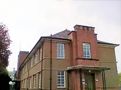 The 1952 extension is a two-storey building, mostly rendered but with red brick towers marking the main entrances. It was designed with its principal elevation facing eastwards towards a proposed public garden off a new access road called Daar Road.[11] The garden plan never came to fruition, with the land for it remaining in the ownership of the adjoining Selkirk Arms Hotel. As such, the main elevation of the 1952 building can only be viewed obliquely from Daar Road or glimpsed from the garden of the Selkirk Arms.[12]
