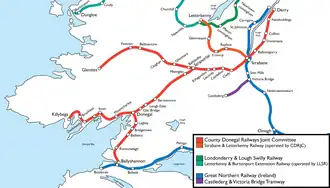 - The Donegal Railway Company lines between Stranorlar and Glenties, Donegal Town to Killybegs, Strabane to Derry, and Donegal Town to Ballyshannon