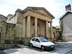 It was succeeded by the old county hall in Record Street, which was designed by Joseph Turner as a record office for the Court of Great Sessions in Wales and completed in 1790. It was enhanced by the addition of a tetrastyle portico with Doric order columns supporting a modillioned pediment in 1866.[2] The Record Street building also served as a courthouse, hosting the county's great sessions (superseded by the assizes in 1832).[3][4] The county's quarter sessions were not regularly held at Ruthin, but alternately at Denbigh and Wrexham.[5]