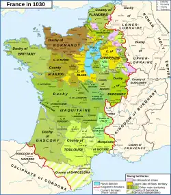 In 958, during the infancy of the Hugh's son, Hugh Capet, Theobald gathered with Count Fulk II of Anjou, who he is allied with since the last King of Brittany perished in 952. Both went so far as to present themselves as "governors and administrators of the kingdom of Neustria" and "counts by the grace of God".[21] From 960 onwards, Theobald got more strongly associated with Carolingian King Lothair, in peculiar during his war against Normandy.[22] However, he did not succeed in getting the agreement of the new Duke Hugh Capet, his direct lordship.