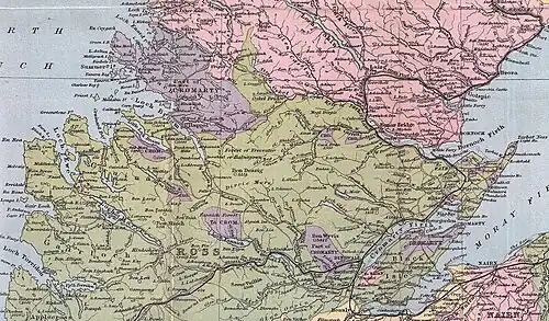 Cromartyshire originally bordered Inverness-shire, but in 1504 an act of parliament purported to create the county of Ross-shire covering the rest of the old province of Ross.[4] In practice, that act was not fully brought into effect. It was not until a subsequent act in 1661 and the appointment of the first permanent sheriff of Ross in 1662 that Ross-shire properly functioned as a shire.[5][2][6] In 1662, Kirkmichael and Cullicudden parishes merged to form the parish of Resolis.[7]