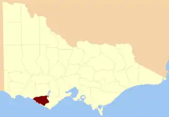 The County of Heytesbury is one of the 37 counties of Victoria which are part of the cadastral divisions of Australia, used for land titles. The county is in the Western District of Victoria bounded by the Gellibrand River in the east and the Hopkins River in the west. In the north, the county was bounded approximately by the existing road, now the Princes Highway. Larger towns include Camperdown and Cobden. The county was proclaimed in 1849.