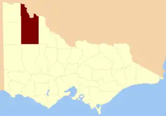 The County of Karkarooc is one of the 37 counties of Victoria which are part of the cadastral divisions of Australia, used for land titles. It is located to the south of the Murray River, with its western boundary at 142°E, and its eastern boundary at 143°E. Its southern boundary is on the 36°S parallel. Lake Tyrrell is located near the eastern boundary. Mildura is located near the north-western edge.