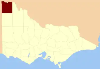 The County of Millewa is one of the 37 counties of Victoria which are part of the cadastral divisions of Australia, used for land titles. It is located to the south of the Murray River, at the north-western corner of Victoria, with the South Australian border to the west. This border was originally intended to be at the 141st meridian of longitude, but because of the South Australia-Victoria border dispute it is several miles to the west of it. The southern boundary of the county is at 35°S, and the eastern at 142°E. The name is also used for the region.