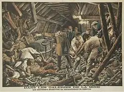 The Courrières mine disaster, Europe's worst mining accident, caused the death of 1,099 miners in Northern France on 10 March 1906.[1] This disaster was surpassed only by the Benxihu Colliery accident in China on 26 April 1942, which killed 1,549 miners.[2] A coal-dust explosion, the cause of which is not known with certainty, devastated a coal mine operated by the Compagnie des mines de houille de Courrières. Victims lived nearby in the villages of Méricourt (404 people killed), Sallaumines (304 killed), Billy-Montigny (114 people killed), and Noyelles-sous-Lens (102 people killed). The mine was 2 km (1 mi) to the east of Lens, in the Pas-de-Calais département (about 220 km, or 140 miles, north of Paris).[3]