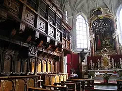 The high altar seen today was designed in 1755 by the Viennese court architect Nikolaus Pacassi, and decorated with a crucifixion by the Viennese academic painter Johann Carl Auerbach, and bronze statues of Saint Francis of Assisi and Saint Teresa of Ávila by Innsbruck court sculptor Balthasar Moll (1768). The Renaissance organ (1560) is by Jörg Ebert of Ravensburg, and described locally as one of the five most famous organs in the world. Domenico Pozzo from Milan painted the organ panels.