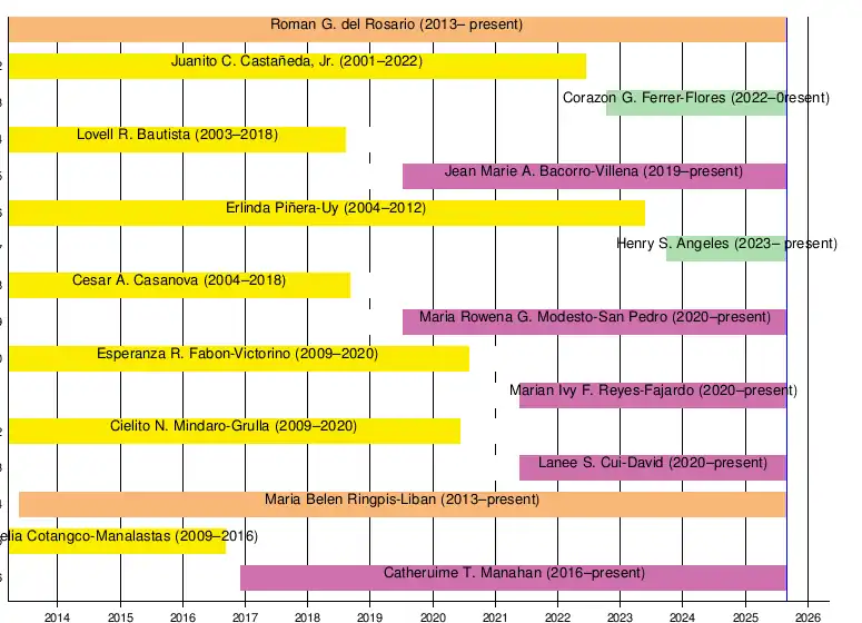 | 15 | Juanito Castañeda Jr. | AJ | October 1, 2001[β] | Macapagal-Arroyo | De Veyra | Acosta | June 24, 2022 |