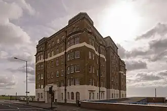 Plans for a block of luxury flats on the site were displayed at Hove Museum in 1934 after being submitted to Hove Corporation. Surgeon and cinema pioneer Edmund Distin Maddick may have been involved in the early stages, but London-based architects Coleridge, Jennings and Soimenow drew up the designs. Construction was complete in 1934. The block had 32 flats across six floors and a penthouse at seventh-floor level.[7] The name Courtenay Gate alluded to neighbouring Courtenay Terrace, a row of houses dating from the 1840s. These may have been named after Elizabeth Courtenay, wife of Lord Charles Somerset, who died in 1815 and has a memorial at St Andrew's Church.[8] The first owner of the block was Maurice Bloom, the architect who in 1939 designed Marine Gate—another large block of luxury flats a few miles east at Black Rock on the edge of Brighton.[9]