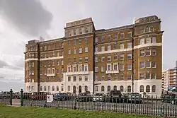 The main building material is yellow gault brick, but the ground floor is rendered and rusticated and a wide band of render also separates the fourth and fifth storeys. Above the fifth storey runs a narrow band of stone, and the parapet (flanking the centrally placed seventh-storey penthouse suite) is also of stone.[15] The use of gault brick helps it relate to the older buildings in the conservation area, even though its age, size and style do not conform to the typical pattern of the area:[15] houses of up to four storeys with decorative exterior features, sash windows and large chimneys, mostly built in the 1870s and 1880s.[12] The south and north elevations are curved outwards,[15] and above the entrance on the north side is a "curious Art Nouveau-style plaster decoration" featuring stylised fleurs-de-lys, sunbursts and crowns. Further decorative plasterwork in the form of Tudor roses is visible on the east wall,[7] which overlooks Hove Lawns. These expanses of grass, separated by paths leading from Kingsway to the beach, run westwards from the old boundary with Brighton as far as Courtenay Gate.[20] In its position at the west end of the Lawns, Courtenay Gate "forms an imposing landmark".[15]