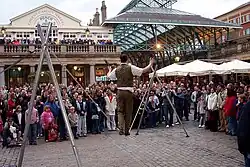 Street entertainment at Covent Garden was noted in Samuel Pepys's diary in May 1662, when he recorded the first mention of a Punch and Judy show in Britain.[105] Impromptu performances of song and swimming were given by local celebrity William Cussans in the eighteenth century.[106] Covent Garden is licensed for street entertainment, and performers audition for timetabled slots in a number of venues around the market, including the North Hall, West Piazza, and South Hall Courtyard. The courtyard space is dedicated to classical music only.