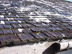 The roof support, attached to the frame, serves as a fixing support for the roof elements. It is usually a lathing or boarding. Lathing is a network of horizontal wooden slats, square or rectangular in section, called battens.[3] In the presence of a flexible underlayment, counter-battens are placed under the lathing. Boarding consists of a decking of boards, which are wooden planks.[4] Alternative industrial solutions, such as fiber cement, exist. Some roofing elements, such as steel roofing or slate, do not require roof support.