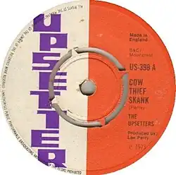 "Cow Thief Skank" is a 1973 single written and produced by Jamaican reggae musician Lee Perry and credited to his studio band the Upsetters. Released in Jamaica through Justice League and in the United Kingdom through Upsetter Records, it is one of Perry's series of 'skank' singles and is a duet between him and deejay Charlie Ace. The song was written as a diss track against fellow producer Niney the Observer, mocking an incident in Niney's youth where his thumb was cut off by a farmer after he attempted to steal one of his cows.