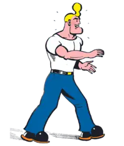 Cowboy Henk is a muscular adult male with a characteristically brawny chin and a long yellow quiff which, according to the jubilee story De Bananenkuif (2001) is made from bananas.[4] Usually Henk wears a white T-shirt with short sleeves, blue pants and black shoes with round noses. In his first gags Henk was a real cowboy, which explains his name.[5]
