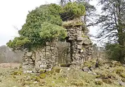 Two abandoned buildings, standing about 20 metres (65 feet) apart are recorded on the 1st edition of the Ordnance Survey 1:2500 map standing respectively within a rectilinear enclosure.[25] One of these buildings was a range containing two compartments of unequal size. An outbuilding projected from the south-west end of the range. The totally demolished building was 'L' shaped in plan[26] and had been removed by 1897.[27]