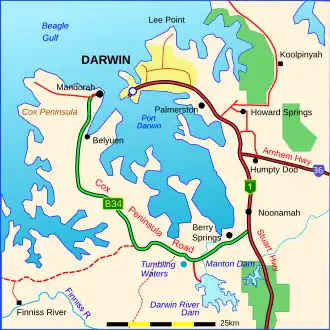 The Cox Peninsula Road is a rural road in the Northern Territory of Australia linking the Cox Peninsula and western shore of Darwin Harbour to the Stuart Highway in the rural suburb of Noonamah on the outskirts of Darwin. The route is approximately 80 km (50 mi) and passes through the town of Berry Springs as well as the rural areas of Tumbling Waters and Blackmore heading west, before turning north towards the Indigenous community of Belyuen. The road ends at a junction with Charles Point Road in Wagait Shire, a few kilometres west of Mandorah on the Cox Peninsula.[1]