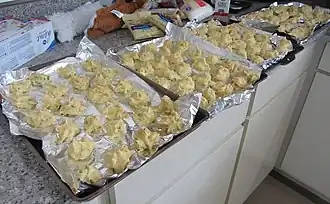 A crab puff is a ball of crab meat, mixed with flour, egg, and seasonings, that has been deep-fried in batter.[1][2] They are often served in restaurants as an appetizer or side dish.[3] They may be served alone, or with any of a variety of sauces, such as tartar sauce, cocktail sauce, or sweet and sour sauce.