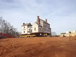 In 2005, Charles Gaddy died, and the land transferred to another development group in 2009.[2] The Crabtree Jones House was scheduled for demolition in 2012.[25] The property, including that on which the house sat, are to be turned into a set of apartment buildings similar to those that have been built recently in other sections of the city. Much of the forest that had covered the remaining one acre property was removed. Fortunately, the nonprofit Preservation North Carolina, with the cooperation of the developer and the local community, was able to move the house off its hill to a nearby 1960s suburban neighborhood that also houses the Jones family cemetery.[2] A key challenge concerning the move was just how exactly the 200-ton house would be transported down a hill of such a steep grade. This was accomplished via the use of computer-controlled hydraulic pumps that kept the house level during its transfer.[25] The move itself had a budget of $632,000, which included placing the house on the steel moving array, transportation, and the purchase and demolition of the existing 1960s ranch home on whose site the Crabtree Jones house was to be placed.[2] The house successfully completed its move on February 4, 2014.[2]