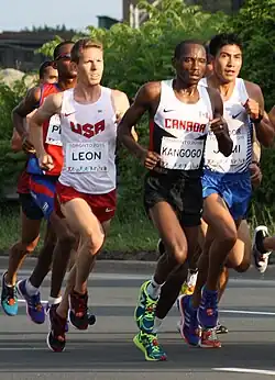 ![]() Leon (left) racing with Kip Kangogo at the 2015 Pan Am Games men's marathon | |