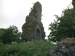 The ruins stand upon a knoll rising out of a plateau, between what appears to have been two marshes or lochans, and the ditches were originally cut between them. One ditch cuts the ridge 117m NE of the castle to form an outer bailey. The castle would have been effectively isolated from the 'mainland', and a significant barrier raised by the water to any potential besiegers at the period when the use of gunpowder was unknown. Two crumbling gables, portions of walls, and shreds of battlements remain, and in the 19th century several underground vaulted chambers survived, although partly filled with rubbish, and home to foxes and bats.[14] The entrance to the castle was at the south-west side by a drawbridge,[15] of which the abutment still survives.[16] The entrance pend or arched passage had a circular watch-tower or bastion to defend it. Within the closing wall was a courtyard surrounded by buildings, and from this courtyard there was an entrance into the great hall, long blocked up.[17]