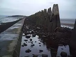 Cramond Island is a tidal island about one mile (1.6 km) out to sea, which is connected to the mainland at low tide across the Drum Sands. A paved path, exposed at low water, allows easy access. This causeway runs at the foot of a row of concrete pylons on one side of the causeway, which were constructed as an anti-boat boom during the Second World War and are one of the most striking sights in the area. At high tide the path is covered by several feet of seawater which cuts the island off from the mainland. It is safe to walk along the raised causeway to the island at low tide, but only if visitors ensure that they leave enough time to return to the mainland before the water rises. The speed at which the tide comes in can easily trap the unwary. A large signpost (located at the start of the causeway) warns visitors of the danger.[3] If this warning is ignored, there can be serious accidents[4] or people may be stranded on the island until the next low tide.[5][6][7] In 2011, a Daniel Defoe of Livingston, West Lothian and an unidentified female found themselves trapped on the island due to miscalculating the times of the tide. This story gained attention due to the ironic parallels with Robinson Crusoe; a novel written by Daniel Defoe published in 1719.[8] Coastguards recommend that the crossing is only attempted during the two hours either side of low water. On the RNLI (Royal National Lifeboat Institution) Queensferry website, there is a list of “safe crossing times” and it states that the “times are given as a guide and may change due to weather and conditions. Times listed in BLACK are the first safe crossing time and those listed in RED are when to be back on the mainland”.[9]