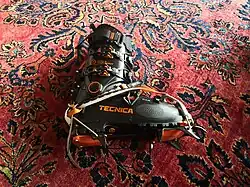 Crampons are fastened to footwear by means of a binding system. Improved attachment systems – such as a cam action "step-in" system similar to a ski binding and particularly well adapted to plastic technical mountaineering boots - have widely increased crampon use. Crampons also use a full "strap-in" system and a "hybrid" binding that features a toe strap at the front and a heel lever at the back.[3]