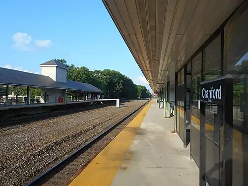 Cranford is an active commuter railroad station in the township of Cranford, Union County, New Jersey. Trains operate between High Bridge and Newark Penn Station (with limited trains continuing to New York Penn Station and Hoboken Terminal) on New Jersey Transit's Raritan Valley Line. The next station east is Roselle Park while west is Garwood. Cranford station contains two side platforms to service three tracks and is accessible for handicapped persons under the Americans with Disabilities Act of 1990.