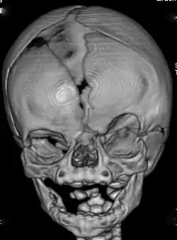 Craniofrontonasal dysplasia (craniofrontonasal syndrome, craniofrontonasal dysostosis, CFND) is a very rare X-linked malformation syndrome caused by mutations in the ephrin-B1 gene (EFNB1).[1][2] Phenotypic expression varies greatly amongst affected individuals, where females are more commonly and generally more severely affected than males.[1][2] Common physical malformations are: craniosynostosis of the coronal suture(s), orbital hypertelorism, bifid nasal tip, dry frizzy curled hair, longitudinal ridging and/or splitting of the nails, and facial asymmetry.[3][4][5][6]