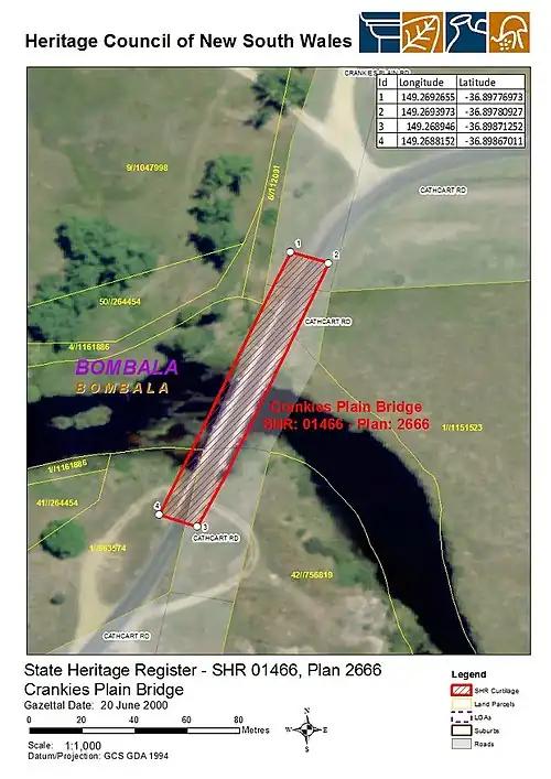 - ^ a b c d e f g h i "Crankies Plain Bridge". New South Wales State Heritage Register. Department of Planning & Environment. H01466. Retrieved 2 June 2018.
