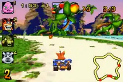 The game has a single-player campaign along with time trial, arcade, and multiplayer modes.[6] In the single-player mode, players progress through hub-based worlds, racing to earn trophies, collect relics, tokens, or crystals, and face boss races.[7] The mode offers two story paths between Crash Bandicoot's team or Doctor Neo Cortex's team.[8] The arcade mode includes single races and cup circuits.[6] In the time trial mode, players can record race times, which could be uploaded to the Vicarious Visions website via passwords.[2][6] The GBA and N-Gage versions support four-player racing via the Game Link Cable and Bluetooth respectively.[2][9] The GBA version can connect with the GameCube version via the GameCube – Game Boy Advance link cable, which unlocks two new characters.[1][10]