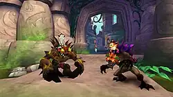 Crash of the Titans received "mixed or average" reviews upon its release, according to Metacritic.[24][25][26] Critics felt that the game's combat, despite the jacking mechanic adding a unique flavor to the gameplay, quickly became repetitive due to the game's lack of puzzles and exploration.[c] They added that the combat was unbalanced by an abundance of enemy characters with inconsistent AI.[27][29][35] Brian Rowe of GameRevolution and Ryan Davis of GameSpot deemed the platforming easy and predictable, and Davis felt that the game lacked a distinct personality, saying that "you could swap Crash out for any number of other cartoony platforming heroes and not really know the difference".[29][30] The game's co-op mode was considered to be enjoyable,[33][34][35] though Rowe found the Leapfrog mode to be "wholly disorienting",[29] and Matt Keller of PALGN deemed the multiplayer mode to be superfluous and not well-implemented.[40] Mike Thomsen of Nintendo World Report observed a slight lag in some of the Wii version's motion controls, which he said highlighted the fact that not all of the game's control's were specifically calibrated to take advantage of the Wii Remote.[39] The camera was criticized for its lack of adjustability, which would often result in attacks by enemy characters outside of the player's range of vision.[d]