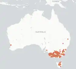 In Tasmania, the species is scattered across 14 locations, recorded in lowland areas across the eastern side of the state, and up to 1,200 m (3,900 ft) above sea level in montane sites in the Central Highlands.[6] It is considered uncommon in wet subalpine and alpine areas.[3]