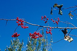 Crataegus phaenopyrum is a species of hawthorn commonly known as Washington hawthorn or Washington thorn.[2] It is widely grown as an ornamental plant, and can reach 10 m (about 32 feet) in height. The small red berry-like fruit grow closely together in large clusters and are food for squirrels and birds. They have a mild flavor and can be eaten raw or cooked. As with other species of hawthorn, the wood is hard and can be used to make tools.