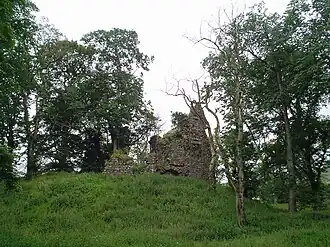 The early earthworks of Crawford Castle comprise a motte around 5 m high, with a surrounding ditch and a bailey some 45 m by 33 m to the south-west. On the motte are the remains of a curtain wall, surrounding an enclosure around 20 m square. There may have been round towers at the corners of this enclosure, which probably dates to the 16th or early 17th centuries. A range of buildings on the south-west side of the castle were built at around the same time. This tower-like range was of three storeys, plus an attic, with a vaulted basement and projecting chimney-breast. To the south-east, a second range was added later in the 17th century, providing more spacious accommodation with larger windows. The prominent arched recess in the east wall suggests that a single storey building of some kind projected from the main structure at this location.[9] Much of the present remains probably date from the 17th century rebuilding by the Marquess of Douglas.