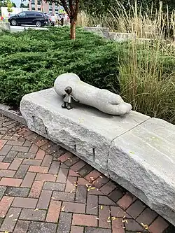 Selected from a group of fifty artists to create a piece for the MAG's sculpture garden,[8] Tom Otterness conceptualized the sculpture series Creation Myth as a parody of the Pygmalion myth.[9] Though the initial story tells of a man who carves a woman out of ivory and brings her to life with a kiss, Otterness' recreation challenges the idea of those gender roles by implying that the sculptor is the woman through the use of the basic shapes society associates with the binary genders.[10][11] Otterness further exemplifies this female-empowering series by alluding to Rochester native, Susan B. Anthony, and her contributions to the anti-slavery and suffragette movement.[2][12]