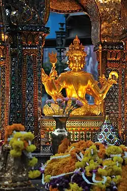 Thích Nhất Hạnh, meanwhile, has written that the idea of the Buddha's "cosmic body", who is both the cosmos and its creator, "is very close to the idea of God in the theistic religions".[65] Similarly, Lin Weiyu writes that the Huayan school interprets Vairocana as "omnipresent, omnipotent and identical to the universe itself".[66] According to Lin, the Huayan commentator Fazang's conception of Vairocana contains "elements that approach Vairocana to the monotheistic God".[66] However, Lin also notes that this Buddha is contained within a broader Buddhist metaphysics of emptiness, which tempers the reification of this Buddha as a monotheistic creator god.[66]