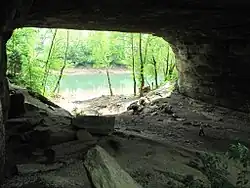 The Creelsboro Natural Bridge consists of Upper Ordovician Period silty dolomite of the Cumberland Formation. Unlike most natural bridges it is made of dolomite rather than sandstone, which generally comes from later geologic ages. First discovered in 1770 by a group of hunters, Rockhouse is a popular site for camping. It was designated a National Natural Landmark by the U.S. National Park Service in 1987.[1] It remains privately owned but is accessible by a short walk from KY 379. Immediately across the river in Clinton County is the private Rockhouse Trace subdivision.