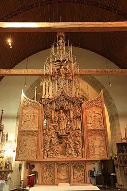 Creglingen is known for the Herrgottskirche outside of the town. It contains a masterwork of late-Gothic sculpture by Tilman Riemenschneider, the Marienaltar. The church is a pilgrimage chapel, established following a reported discovery of an undamaged communion wafer by a peasant ploughing his field in 1384. This wafer was thought to be the cause of miracles and people flocked to the site. The local lords, Konrad and Gottfried von Hohenlohe-Brauneck, had a Gothic chapel built in 1386–96. At the pilgrimage's peak around 1500 a number of altars were ordered that remain in the church today. The central altar by Riemenschneider was built on the spot where the wafer was reportedly found. The figures are made from the wood of linden trees, the surrounding frames from pine trees. At a total height of 11 meters the altar dominated the small church. Although Reformation reached the area in 1530, its iconoclasm spared the local church. The altar wings of the main altar were closed, however, as the depicted Assumption of Mary was offensive to the Protestant congregations. Its good state of preservation is owed to the fact that the wings of the altar remained closed and the whole was covered by funeral wreaths until 1832.[3]: 121–2