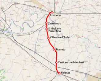 | Cremona–Fidenza railway | ||||||||||||||||||||||||||||||||||||||||||||||||||||||||||||||||||||||||||||||||||||||||||||||||||||||||||||||||||||||||||||||||||||||||||||||||||